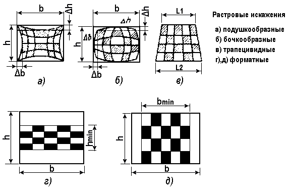 На рис. 7.1 представлены основные типы линейных растровых искажений, к которымотносятся: подушкообразные, бочкообразные, трапецеидальные.