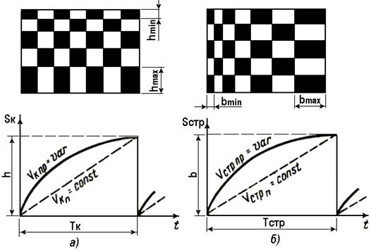 Нелинейные геометрические искажения (рис.7.2)возникают из-за непостоянства скоростей движения лучей по вертикали или горизонтали, то есть из-за нелинейности токов кадровой (рис.9.2.а)или строчной развертки (рис.7.2.б).