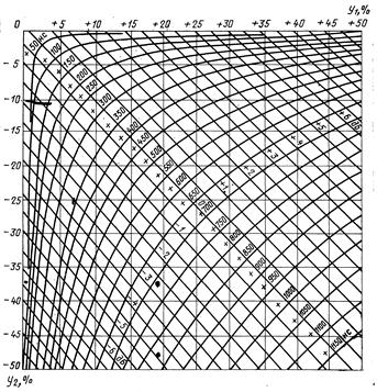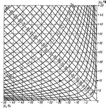 Рис. 8.12 - Графики для определения различия усиления и расхождения во времени сигналов яркости и цветности при отрицательном y1 и положительном y2 (сигнал яркости отстает от сигнала цветности)