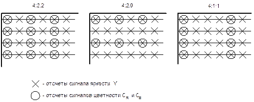 На рисунке показаны примеры часто используемых форматов дискретизации. Цифры в названиях форматов определяют соотношение яркостной и цветовой четкости по вертикали и горизонтали.