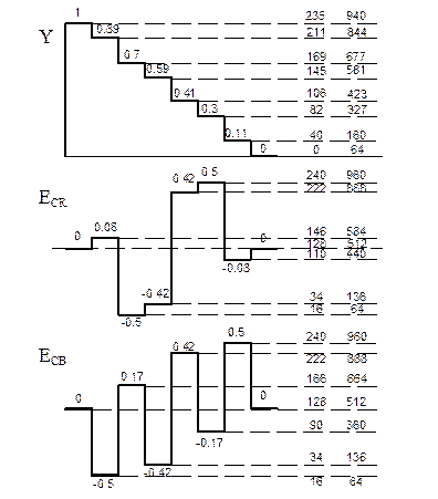 Формирование цифровых сигналов происходит в два этапа. Первый шаг – это операция масштабирование. Ее цель привести размахи аналоговых сигналов до единицы. Эта операция производится только с сигналами цветности, т.к. номинальный размах яркостного сигнала единице. Сигнал цветности R-Y лежит в пределах от -0.7 (в голубом) до 0,7 (при красном). B-Y лежит в пределах от -0,89 (в желтом) до 0,89 (в синем). Эти сигналы умножаются на соответствующие масштабирующие коэффициенты: КR=0,5/0,7, КB=0,5/0,89. Таким образом, после операции масштабирования размахи этих сигналов будут равны единице от-0,5 до 0,5.