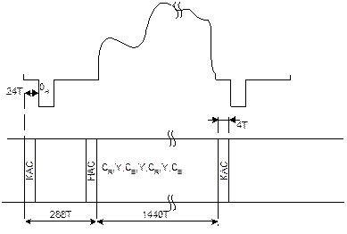 На рисунке 10.3 все длительности указаны в периодах Т тактовой частоты 27 МГц, т.к. именно с этой частотой передаются отсчеты сигналов яркости и цветности 13,5МГц+6,75МГц+6,75МГц=27МГц. Синхрослова состоят из 4 байт и начинаются с неизменной преамбулы FF 00 00 (при 8-разрядном кодировании). Четвертый байт несет информацию о четности или нечетности поля, о том активная или пассивная строка, и о виде синхрослова (КАС или НАС). Синхросигнал КАС опережает начало аналоговой строки (точка 0H середина фронта ССИ) на 24 тактовых периода. Активная часть строки состоит из 1440 отсчетов, из них 720 отсчетов сигнала яркости и по 360 отсчетов сигналов цветности (формат 4:2:2). Отчеты передаются в последовательности CR,Y,CB,Y со скоростью 27 Мслов в секунду. Есть возможность передачи дополнительной информации во время цифровых интервалов гашения с такой же скоростью. Вся строка – 1728 тактовых периода 64мкс*27МГц=1728.