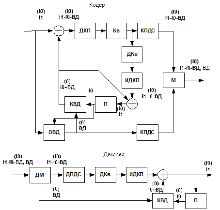 Схема кодера отличается от предыдущей наличием определителя вектора движения ОВД, компенсатора вектора движения КВД, еще одного кодера с переменной длинной слова КПДС и мультиплексора М. Во время передачи опорного кадра I0 КВД отключен, и на выходе вычитателя действует I0. Во время передачи I1 в ОВД сравниваются текущий I1 и предыдущий I0 кадры, и рассчитываются вектора движения для каждого макроблока. В КВД все блоки изображения в предыдущем кадре I0 переставляются согласно рассчитанным векторам движения, формируется кадр I0+ВД. Теперь сравним I1 и I0+ВД: они очень похожи, т.к. все элементы изображения в кадре I0+ВД находятся там же, где и в кадре I1 (движение скомпенсировано). Разностный кадр I1-I0-ВД имеет большое количество нулевых зон и при внутрикадровом кодировании будет описан минимумом информации. Вектора движения так же кодируются с переменной длинной слова и в мультиплексоре замешиваются в единый цифровой поток. В декодере вектора движения выделяются из общего потока в демультиплексоре Дм. В КВД блоки предыдущего изображения переставляются, согласно им формируется I0+ВД, а в сумматоре складывается с I1-I0-ВД (формируется кадр I1). Передаваемое изображение сформировано при минимуме переданной информации.