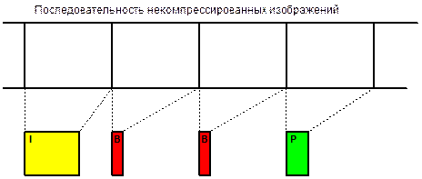Изображения типа I кодируются внутрикадрово (опорные). Изображения типа Р кодируются на основе предыдущих изображений типа I или Р. Используется межкадровое кодирование, поэтому они по объему информации в 3 раза меньше, чем I изображения. Изображения типа В двунаправленные, кодируются на основе предыдущих и последующих изображений I или Р типа и поэтому их объем в 1,5 раза меньше, чем у Р-изображений.