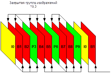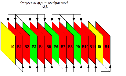 Группы изображений бывают открытые и закрытые. Открытые группы изображений (рисунок 11.10) заканчиваются на В-изображениях и связаны между собой. Нет возможности монтажа без декодирования сигнала. А перекодирование сигнала приведет к появлению дополнительных искажений, если вторичное кодирование не произведено по тем же параметрам, что и первичное. Широко используются закрытые группы изображений (рисунок 12.4).