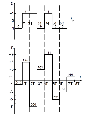 Рис. 15.1 Двухуровневые и восьмиуровневые модулирующие сигналы