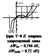 На рисунке изображены вольт-амперные характеристики p-n-переходов, выполненных из Ge, Si, GaAs. Зная значения ширины запрещенных зон полупроводниковых кристалловΔW Ge =0.69 эВ, ΔW Si =1.12 эВ, ΔW GaAs =1.43 эВ легко определить, что кривые 1 и 6 – Ge, 2 и 5-Si, 3 и 4 –GaAs. Параметрами диодов являются статическое R=U0/I0 и дифференциальное сопротивлениеRi=ΔU/ΔI, и крутизна ВАХ-величина, обратная Ri. Нелинейность вольт-амперной характеристики p-n–перехода объясняется примесными дефектами кристаллической структуры. Уравнение вольт-амперной характеристики p-n-перехода
