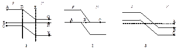 Туннельные диоды на ВАХ имеют падающий участок- с отрицательным дифференциальным сопротивлением, который используется для генерации сигналов. Для переключательных диодов отношение пикового тока I п (максимального- в точке А) к току впадины - I в (минимальному- в точке С)– должно быть максимально возможным, оно характеризует различимость двух логических уровней сигнала. Туннельные диоды обладают чрезвычайно малой инерционностью, так как имеют малую диффузионную емкость. Энергетическая диаграмма ТД в состоянии равновесия изображена на рис. 3. На рис. 1 – энергетическая диаграмма обычного диода на р-n-переходе, образованного низколегированными полупроводниками (обычный p-nпереход). Диод с критической концентрацией примесей, когда уровень Ферми соответствует в р-области энергии потолка валентной зоны, а в n-области энергии дна зоны проводимости, имеет диаграмму, как на рис.2. Такой диод называется обращенным. В прямом включении у него есть проводимость, но при более высоких напряжениях, чем при обратном, причем в обратном включении -за счет туннельного эффекта, а в прямом за счет инжекции носителей. Поэтому считается, что выпрямляющим эффектом обращенные диоды обладают при обратном включении и основными кривыми, поясняющими принцип действия обращенного диода являются ВАХ 3 и 4. Германиевый диод характеризуют кривые 2 и 3, из антимонида галлия- 1 и 4.