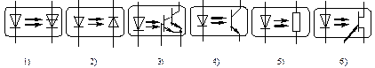 Оптрон – прибор, содержащий источник и приемник излучения, помещенные в один корпус. В оптроне электрическая энергия преобразуется в оптическую, затем из оптической в электрическую, в оптроне входная и выходная цепь гальванически развязаны друг от друга. Свойства зависят как от приемника, так и от излучателя. В оптронной паре в качестве излучателей используются светоизлучающий диод, инфракрасные диод, лазерный диод, электролюминесцентные излучатели, в качестве приемника излучения – фотодиоды, фототранзисторы, фоторезисторы, фототиристоры. Классифицируются оптроны по фотоприемникам. На рис. УГО оптронов:1. динисторный, 2-диодный, 3,4,6-транзисторные, 5-резисторный.
