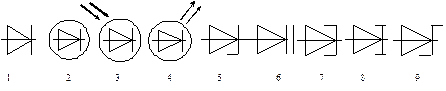 Условно-графические обозначения диодов показаны на следующем рисунке: 1-импульсные и выпрямительные диоды, 2-СВЧ- диоды, 3-фотодиод, 4-светодиод, 5- стабилитрон, 6-варикап, 7-туннельный диод, 8- обращенный диод, 9- диод Шоттки.