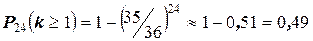 . Нетрудно видеть, что испытания, т.е. подбрасывания двух игральных костей 24 раза, удовлетворяют схеме Бернулли, следовательно вероятность одновременного появления двух шестерок хотя бы один раз равна