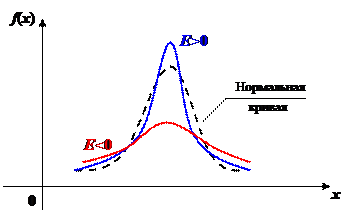 Эксцесс характеризует островершинность или плосковершинность распределения случайной величины (другими словами, эксцесс служит для оценки «крутости», то есть большего или меньшего подъёма кривой теоретического распределения по сравнению с нормальной кривой). Забегая немного вперёд, скажем, если эксцесс некоторого распределения отличен от нуля, то кривая этого распределения отличается от нормальной кривой: если эксцесс положительный, то кривая имеет более высокую и «острую» вершину, чем нормальная кривая; если эксцесс отрицательный, то сравниваемая кривая имеет более низкую и «плоскую» вершину, чем нормальная кривая (см. рис.). Для нормального распределения