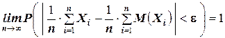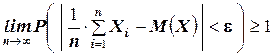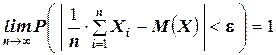 ТЕОРЕМА Чебышева (частный случай): Пусть Х 1 , Х 2 , …, Хn – попарно независимые случайные величины, имеющие одно и то же математическое ожидание М (Х), и пусть дисперсии этих величин равномерно ограничены (то есть не превышают некоторого постоянного числа С). Тогда, при достаточно большом числе независимых опытов среднее арифметическое наблюдаемых значений случайных величин сходится по вероятности к их математическому ожиданию, то есть имеет место равенство: