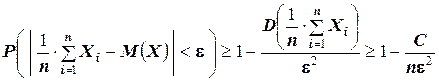 ТЕОРЕМА Чебышева (общий случай): Пусть Х 1 , Х 2 , …, Хn – попарно независимые случайные величины, и пусть дисперсии этих величин равномерно ограничены (то есть не превышают некоторого постоянного числа С). Тогда, при достаточно большом числе независимых опытов среднее арифметическое наблюдаемых значений случайных величин сходится по вероятности к среднему арифметическому их математических ожиданий, то есть имеет место равенство: