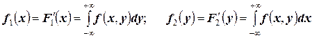 Пусть известна плотность распределения системы двух случайных величин. Используя свойства функций распределения, можно вывести формулы для нахождения плотности распределения одной величины, входящей в систему:
