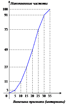 Решение. Воспользовавшись определением и правилом построения кумуляты интервального вариационного ряда, нетрудно построить кумулятивную кривую данного распределения (см. рисунок).