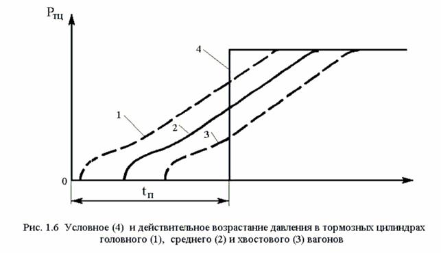 Время подготовки тормозов к действию определяется из условия замены медленного, реального процесса наполнения тормозного цилиндра среднего вагона, мгновенным наполнением до полной величины, при условии равенства тормозных путей, проходимых поездом при реальном и условном наполнении тормозных цилиндров (рис. 1.6).