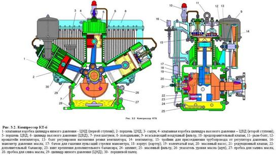Компрессор КТ-6 состоит из корпуса (картера) 13, двух цилиндров 29 низкого давления (ЦНД), имеющих угол развала 120°. одного цилиндра 6 высокого давления (ЦВД) и холодильника 8 радиаторного типа с предохранительным клапаном 10, узла шатунов 7 и поршней 2, 5.