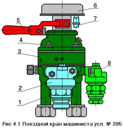 Поездной кран (Рис. 4.1) состоит из пяти пневматических частей: корпуса нижней части 1. редуктора зарядного давления 2, средней части 3, крышки 4, стабилизатора темпа ликвидации сверхзарядного давления 8 и электрического контроллера 6.