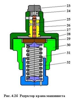 Редуктор (Рис. 4.2.б) предназначен для автоматического поддержания определенного зарядного давления в уравнительном объеме крана при поездном положении ручки. Редуктор состоит из двух частей: верхней 26 и нижней 30, между которыми зажата металлическая диафрагма 28. В верхней части корпуса расположено седло 27 питательного клапана 25, пружина 24 и заглушка 23. В нижнюю часть ввернут регулировочный стакан 32, с помощью которого изменяется усилие регулировочной пружины 31 на опорную шайбу 29.