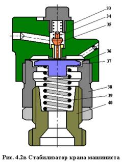 Стабилизатор темпа ликвидации сверхзарядного давления (Рис.4.2.в) предназначен для автоматической ликвидации сверхзарядного давления из уравнительного объема крана постоянным темпом при поездном положении ручки. Стабилизатор состоит из крышки 33 с калиброванным отверстием диаметром 0,45 мм, возбудительного клапана 35 с пружиной 34, металлической диафрагмы 36, пластмассовой шайбы 37, корпуса 38, регулировочной пружины 39 и регулировочного винта 40 с контргайкой.