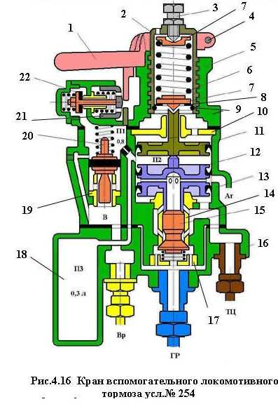 В нижней части крана (привалочной пните) 16 расположена дополнительная камера объемом 0,3 л и штуцеры для подключения трубопроводов от главных резервуаров (ГР), воздухораспределителя (ВР) и тормозных цилиндров (ТЦ).