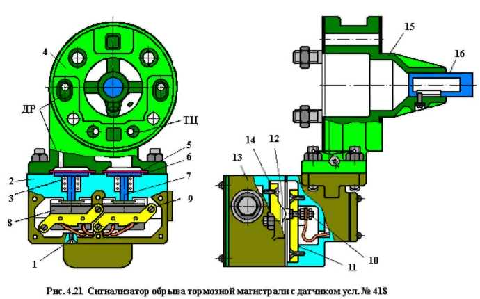 Сигнализатор обрыва тормозной магистрали с датчиком № 418 (Рис.4.21) устанавливается между главной частью и двухкамерным резервуаром воздухораспределителей усл.№ 483 и предназначен для сигнализации машинисту о нарушении целостности тормозной магистрали поезда и одновременного выключения тягового режима локомотива.
