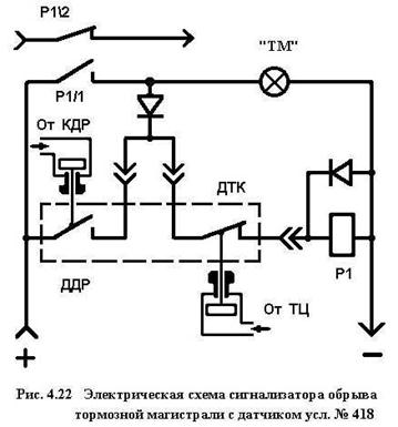 Однако, если обрыв ТМ произошел вблизи локомотива, то его воздухораспределитель может наполнить ТЦ до давления 1,0 – 1,2 кгс/см2. При этом также происходит кратковременное загорание и погасание сигнальной лампы, но электрическая цепь управления режимом тяги будет отключена, то есть в данном случае будет отсутствовать световая сигнализация нарушения целостности ТМ.
