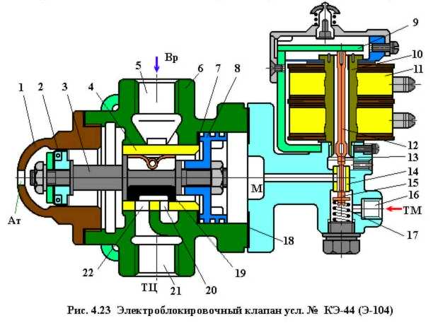 Поршень 3 в крайних положениях уплотнен прокладками 7 и 18. Между двумя буртами стержня 3 помещен золотник 19 с выемкой. Запрессованная в корпус 6 золотниковая втулка 4 имеет отверстие 22 диаметром 9 мм для сообщения воздухораспределителя с каналом 21 ТЦ и отверстие 20 диаметром 6 мм для сообщения ТЦ с атмосферой. Электроблокировочный клапан имеет также канал 5 для сообщения с воздухораспределителем или с краном вспомогательного тормоза. Атмосферное отверстие в крышке 1 исключает создание противодавления при перемещении поршневой системы в крайнее левое положение.