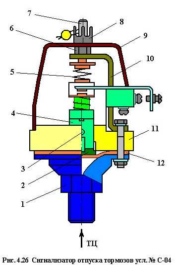 При давлении в ТЦ более 0,3 – 0,4 кгс/см2 контакты сигнализатора замыкаются и на пульте машиниста загорается сигнальная лампа, при меньшем давлении в ТЦ контакты размыкаются и сигнальная лампа гаснет. Сигнализаторы монтируют на тормозных цилиндрах или на трубопроводах к ТЦ и подключают в электрическую схему параллельно с тем, чтобы при неотпуске любого ТЦ сигнальная лампа на пульте машиниста продолжала бы гореть.