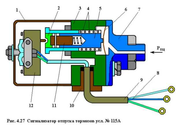 Сигнализатор отпуска тормозов усл.№ 115А (Рис.4.27) состоит из крышки 1 и корпуса 3, между которыми помещена резиновая диафрагма 6. При давлении в ТЦ более 0,3 – 0,4 кгс/см2 диафрагма прогибается и воздействует на стержень 5,который через толкатель 11 и упор 2 замыкает контакты микропереключателя 12 - на пульте машиниста загорается сигнальная лампа. При меньшем давлении в ТЦ стержень 5 и толкатель 11 под действием пружин 4 перемещаются влево, обеспечивая тем самым размыкание контактов микропереключателя 12 и погасание сигнальной лампы. Сигнализатор усл.№ 115 А имеет такие же характеристики, что и сигнализатор усл.№ 352А.