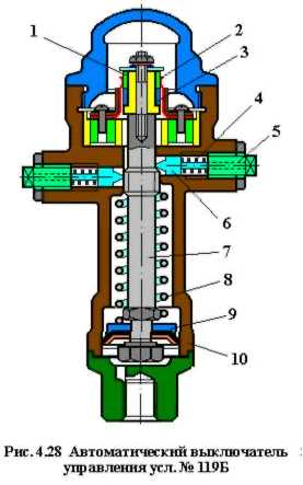 АВУ № 119Б состоит из корпуса 10, в котором находится поршень 9, закрепленный на стержне 7 и нагруженный пружиной 8. В корпусе находятся также упругие скользящие контакты 2 и два конических стопора 6, нагруженные пружинами 4, затяжка которых может изменяться регулировочными винтами 5. На стержне 7 расположены изоляционное кольцо 1 и металлическое кольцо 3. Конические стопоры 6 служат для регулирования давления сжатого воздуха, при котором замыкаются и размыкаются электрические контакты 2.