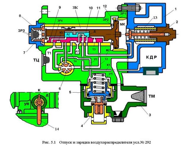 Воздухораспределитель состоит из магистральной части 11 с режимным переключателем, крышки 1 с камерой дополнительной разрядки (КДР) и ускорителя экстренного торможения 3. В корпусе крышки 1 расположен фильтр 13, буферное устройство 2 и камера дополнительной разрядки объемом 1 л. В корпусе магистральной части размещены магистральный и переключательный органы. Магистральный орган имеет магистральный поршень 12, главный 9 и отсекательный 10 золотники. Свободный продольный ход главного золотника в хвостовике магистрального поршня составляет 7 мм. В корпус 11 с левой стороны ввернута заглушка 8 со сквозным отверстием к ЗР. Заглушка является упором для пружины буфера отпуска 7.
