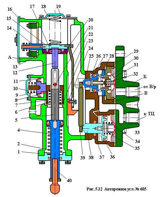 Управляющая часть состоит из корпуса К в котором перемещается поршень 4 с наконечником 40, шток 5, стакан 7, ползун 15 с толкателем 12 и подвижным контактом 14 (для авторежима № 606). Контактная группа авторежима № 606 закрыта крышкой 16.