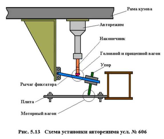 При закрытых наружных дверях наконечник авторежима находится от неподрессоренной части тележки вагона на расстоянии, исключающим динамическое воздействие на него. Величина давления в ТЦ при торможении устанавливается управляющей частью авторежима в зависимости от величины прогиба рессорного подвешивания, которая зависит от загрузки вагона.