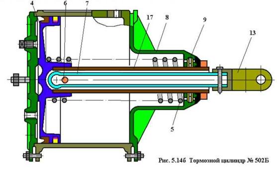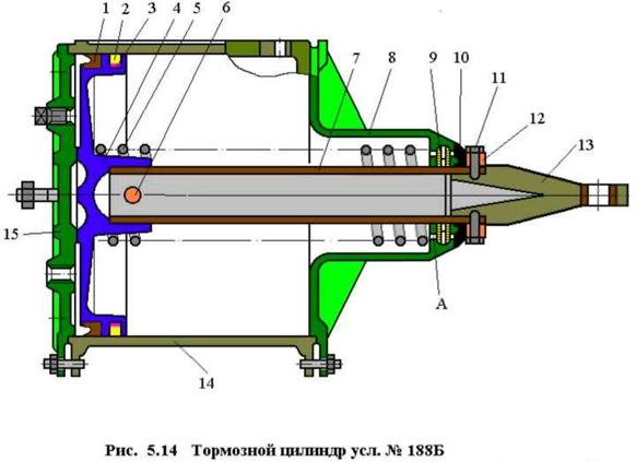 Тормозной цилиндр состоит из литого чугунного корпуса 14, передней крышки 8 с удлиненной горловиной и задней крышки 15, уплотненной резиновым кольцом. Задняя крышка крепится к корпусу большим количеством болтов, чем передняя, так как испытывает усилие сжатого воздуха до 4 тс, в то время, как передняя крышка нагружена только отпускной пружиной 5, имеющей предварительную затяжку 150 - 160 кгс.