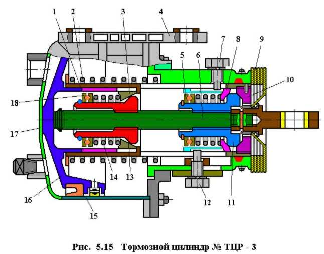Тормозной цилиндр ТПР-3 состоит из корпуса 15 с приварным дном 17 и привалочного фланца 4. Внутри корпуса помещен стакан 1 регулятора, на который воздействует усилие возвратной пружины 2. Поршень 16 с резиновой манжетой и смазочным кольцом вставлен своей направляющей частью в стакан 1. Шток 6 поршня имеет несамотормозящую резьбу, на которую навернуты регулировочная 13 и вспомогательная 11 гайки. На цилиндрической части гаек 11 и 13 стопорными кольцами закреплены упорные шарикоподшипники 5 и 18. Коническая часть гаек 11 и 13 прижимается пружинами, действующими через шарикоподшипники. к конусным втулкам 8 и 3. Стакан регулятора закрыт резьбовой крышкой 10, имеющей с внутренней стороны коническую фрикционную поверхность, через которую стакан опирается на вспомогательную гайку 11.