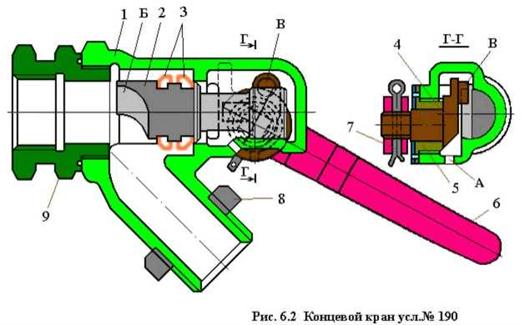 Кран состоит из корпуса 1, клапана 2 с отражателем (полусферической поверхностью) «Б», двух резиновых уплотнительных колец 3, эксцентрикового кулачка 4, гайки 5 и ручки 6, укрепленной на квадрате кулачка шплинтом 7. Контргайка 8 служит для уплотнения и крепления тормозного соединительного рукава на отростке концевого крана.