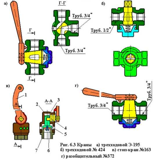 Трехходовой кран усл.№ 424 (Рис. 63 б) отличается от крана усл.№ Э-195 тем, что не имеет атмосферного отверстия.