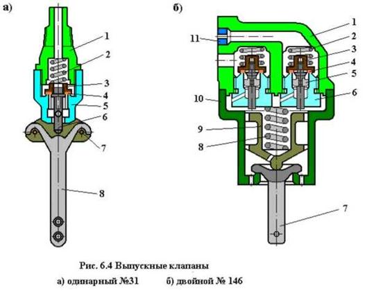 Выпускной одинарный клапан усл.№ 31 (Рис. 6.4 а) служит для отпуска вручную тормоза отдельного вагона, для выпуска воздуха из резервуаров и внутренних камер воздухораспределителя при его выключении, а также используется на пассажирских локомотивах для выпуска воздуха из ТЦ. Клапан состоит из корпуса 5 с атмосферным отверстием «Ат» и ручки 8, подвешенной к корпусу на двух шпильках 7. В верхнюю часть корпуса ввернут штуцер 1, с помощью которого клапан монтируется на трубопроводе. Внутри корпуса расположен собственно клапан, состоящий из стержня 6, шайбы 3 и прокладки 4. Клапан прижат к седлу пружиной 2. При оттягивании ручки в сторону, ее противоположный конец упирается в шпильку, а средняя сферическая часть - в стержень 6. При этом шайба 3 приподнимается и сообщает полость штуцера с атмосферным через отверстие «Ат» в нижней части корпуса.
