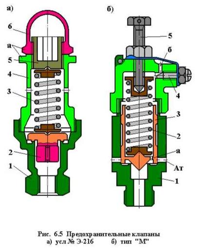 Предохранительные клапаны типа «М» (Рис. 6.5 б) устанавливаются на электровозах чешского производства. Клапан имеет корпус 1, в котором расположен нагруженный пружиной 2 срывной клапан 3 стаканчатого типа. Необходимое усилие пружины обеспечивается регулировочным винтом 5. Клапан 3 имеет рабочую (малую) площадь воздействия сжатого воздуха, равную диаметру седла клапана в корпусе, и срывную (большую) площадь, равную диаметру клапана 3.