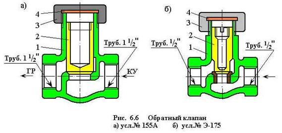 Обратный клапан усл.№ Э-175 (Рис. 6.6 б) аналогично принципу действия описанному выше и устанавливается на трубопроводах с резьбой ½", в частности на электровозах и электропоездах между резервуаром управления и питательной магистралью.