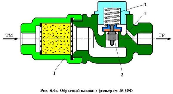 Обратный клапан усл.№ ЗОФ (Рис. 6.6 в) устанавливают между питательной и тормозной магистралями для зарядки ГР локомотива при его пересылке в холодном состоянии. Перед обратным клапаном со стороны ТМ устанавливают разобщительный кран (кран холодного резерва), при открытии которого воздух из тормозной магистрали проходит через расположенный в корпусе 1 фильтр, поднимает нагруженный пружиной 3 клапан 2 с резиновым уплотнением и далее через отверстие 4 диаметром 5 мм попадает в ГР. Пружина 3 не позволяет сжатому воздуху перетекать из ГР в ТМ при снижении в ней давления. Отверстие 4 препятствует резкому падению давления в ТМ в процессе зарядки из нее главного резервуара.