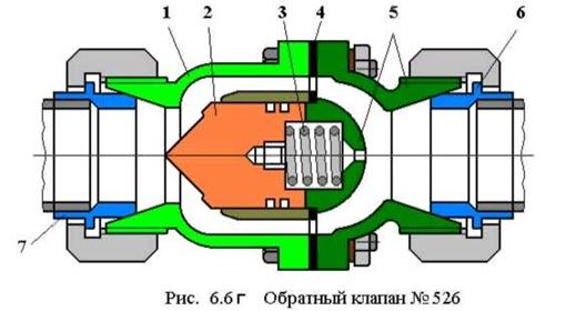 Обратный клапан усл.№ 526 (Рис. 6.6 г) состоит из корпуса 1, крышки 5, собственно клапана 2 и пружины 3. Между корпусом и крышкой помещена уплотнительная прокладка 4. К наконечникам 6 и 7 присоединяются трубы соответственно от ГР и компрессора. Благодаря наличию пружины клапан может работать как в горизонтальном, так и в вертикальном положениях. При выключении компрессора давления по обе стороны клапана 2 выравниваются, и он прижимается к седлу в корпусе под действием пружины.
