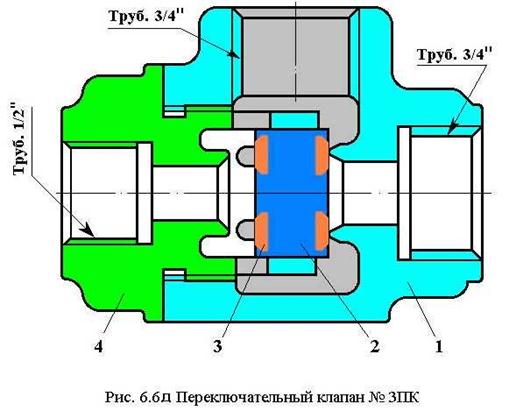 Переключательный клапан усл.№ ЗПК (Рис. 6.6 д) предназначен для автоматического отключения трубопроводов, тормозных приборов или резервуаров в процессе работы пневматической тормозной схемы локомотива. В частности, переключательный клапан используется для отключения ТЦ локомотива от воздухораспределителя при действии крана вспомогательного тормоза (КВТ) и наоборот. Клапан состоит из корпуса 1, крышки 4 и собственно клапана 2 с двумя прокладками 3. Корпус имеет два отростка с резьбой ¾" для присоединения к ТЦ и КВТ. В крышке имеется один отросток с резьбой ½" для подключения трубопровода от воздухораспределителя (ВР).