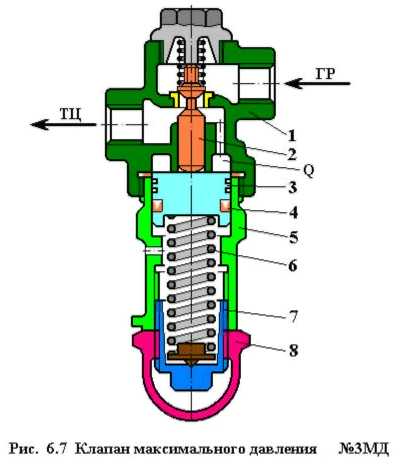 Клапан усл.№ ЗМД (Рис. 6.7) состоит из корпуса 1, стакана 5 и предохранительного колпачка 8. Внутри корпуса расположен собственно клапан 2, нагруженный пружиной. Корпус имеет приливы для присоединения соответствующих трубопроводов. В стакане находится поршень 3, который уплотнен резиновой манжетой 4 и нагружен регулировочной пружиной 6, затяжка которой может изменяться с помощью регулировочной гайки 7.