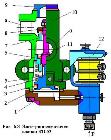 Электропневматический клапан КП-53 (Рис. 6.8) применяется на грузовых электровозах, оборудованных электрическим тормозом, и используется для подачи сжатого воздуха в цилиндры догружающих устройств или в цепь замещения электрического тормоза пневматическим.