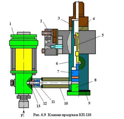 Клапан продувки КП-110-01 (Рис. 6.9) состоит из клапанной системы и пневматического привода, размещенных в корпусе 6, а также электромагнитного вентиля броневого типа и нагревательного элемента.