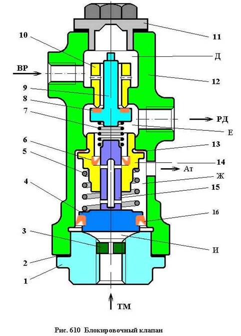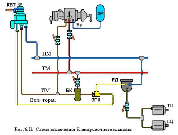 Блокировочный клапан (Рис. 6.10.) состоит из корпуса 12, крышки 1 с дроссельной шайбой 3 и заглушки 11. Крышка и заглушка установлены на прокладках 2. Корпус клапана имеет отводы к воздухораспределителю (ВР) и к управляющей камере реле давления (РД), а также отверстие (Ат) для выхода воздуха в атмосферу. Крышка 1 блокировочного клапана присоединяется к отводу тормозной магистрали (ТМ).
