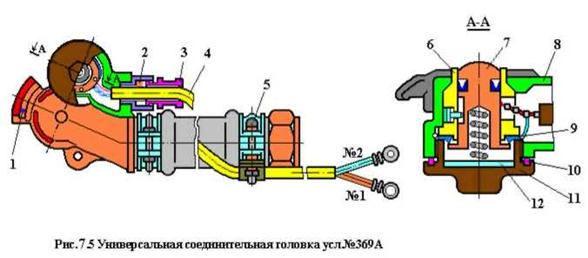 Междувагонные соединения представляют собой соединительные рукава с универсальными головками усл.№369А (рис. 7.5). Корпус головки имеет прилив, в котором помещен контактный палец 7 со сферической контактной поверхностью, уплотненный резиновой манжетой и нагруженный пружиной 12. Контактный палец изолирован от корпуса головки с помощью пластмассовой втулки 6, которая закреплена крышкой 11. Крышка 11 также зажимает металлическое контактное кольцо 9, свободно расположенное на пальце. Внутренняя полость головки уплотнена резиновыми кольцами 8 и 10.